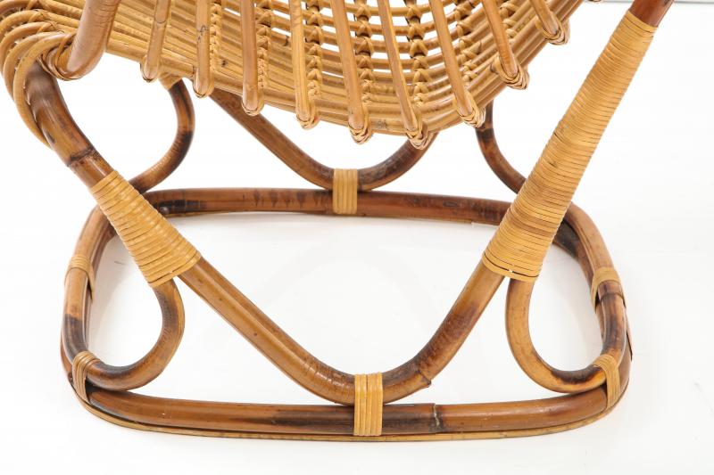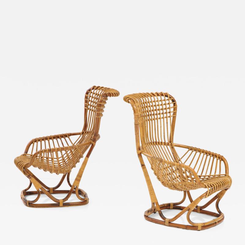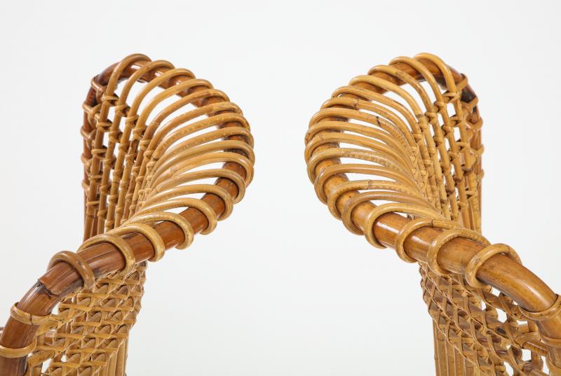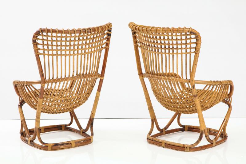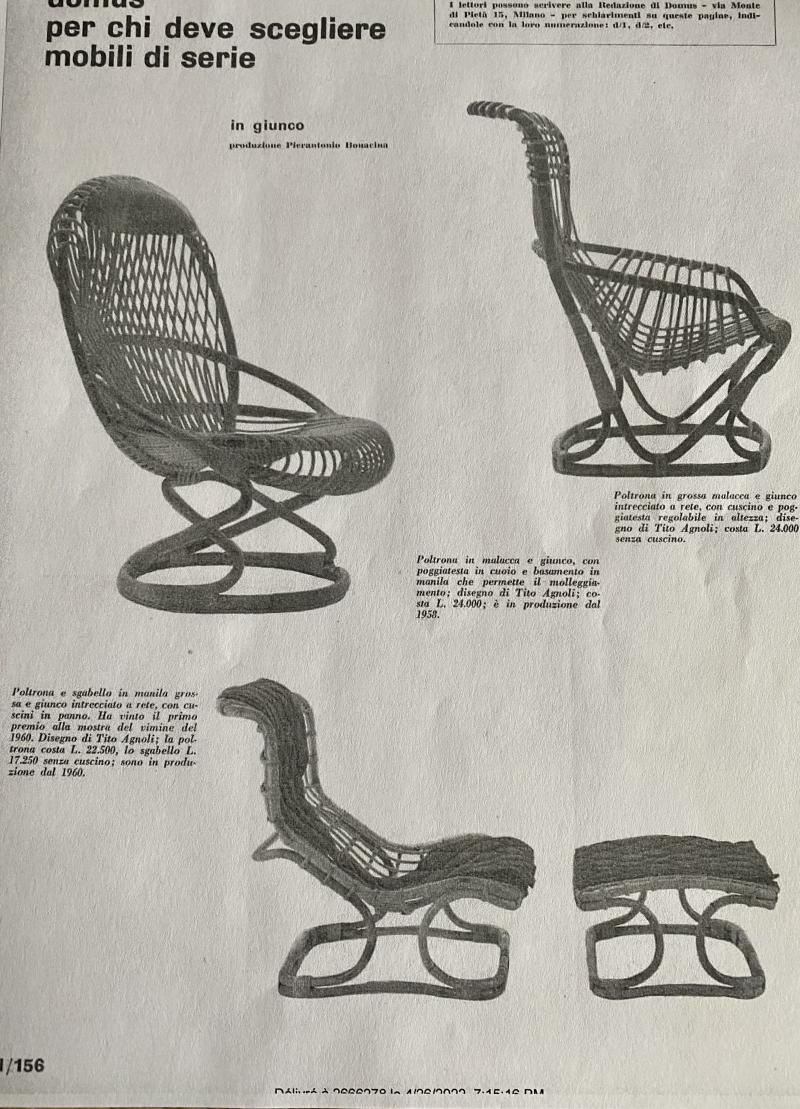 Pair of Rattan Armchairs designed by Tito Agnoli for the Pierantonio Bonacina Company. The company made rattan furniture starting in the late nineteenth century. They imported the materials but designed and built their furniture in Erba Italy, which is in the center of the Italian furniture making area around Como. Designers of Bonacina furniture often trained at the prestigious Politechnico di Milano. Because the design was a success, there were knock-offs made by other companies. These chairs are the originals from Bonacina. The last image shows a page from the Sept 1963 Domus Magazine. The chair is on the upper right corner with its description.