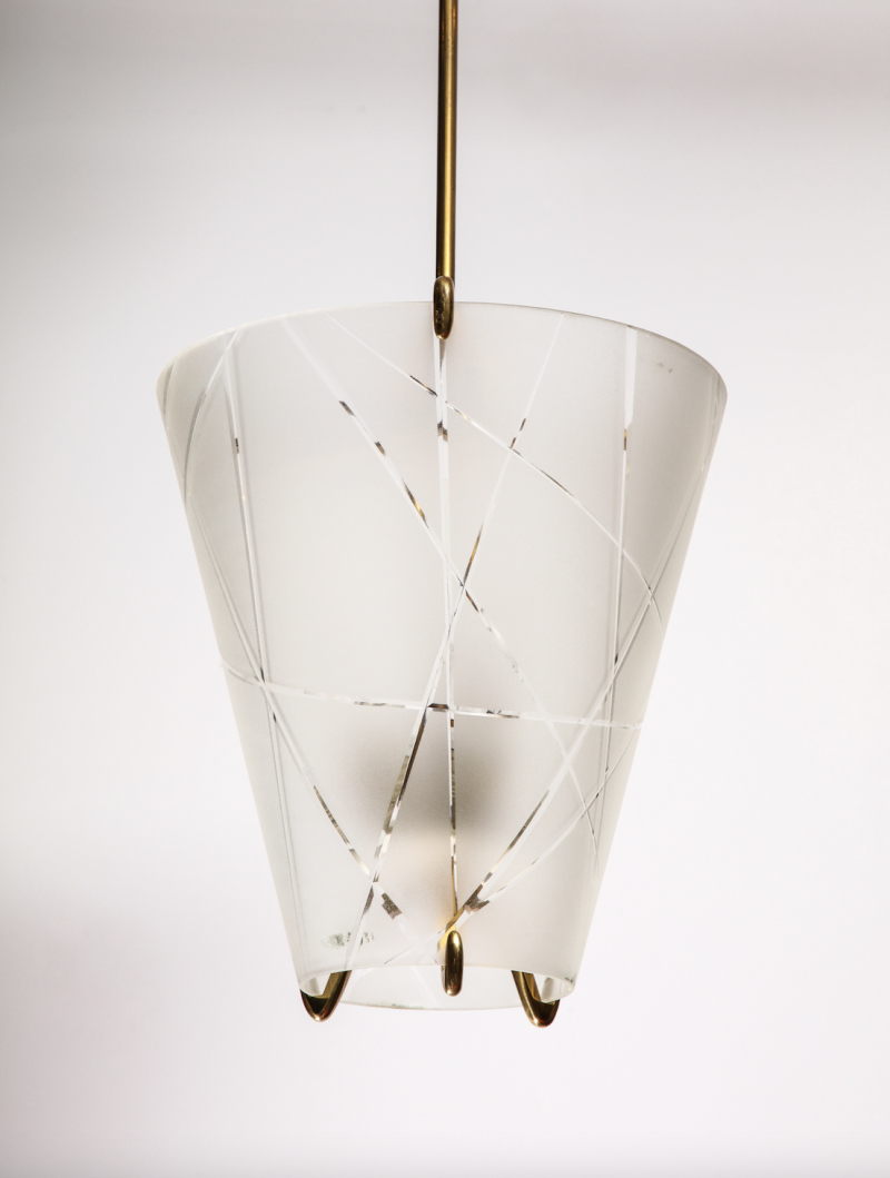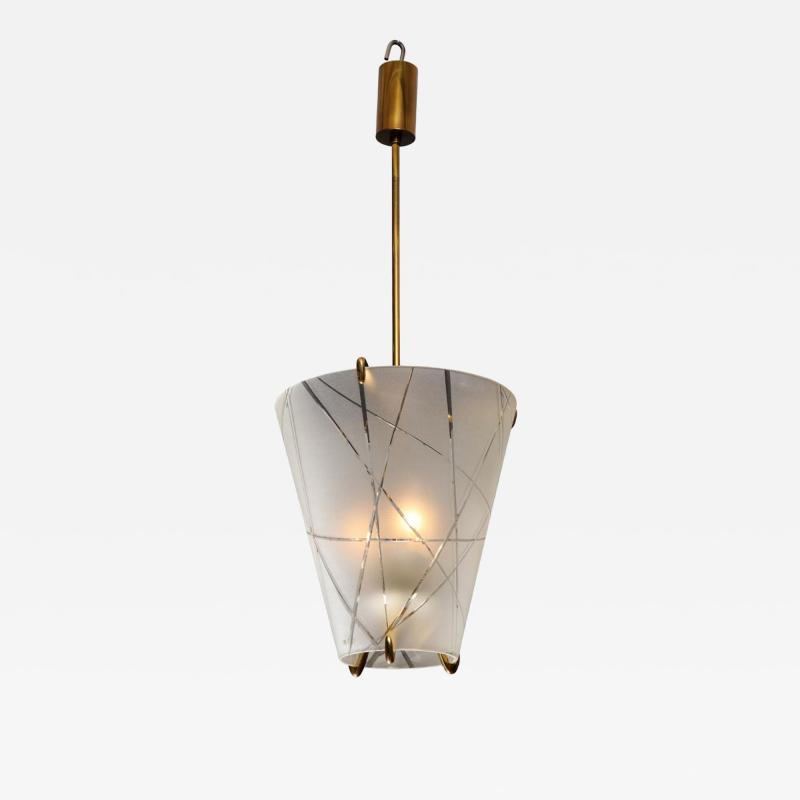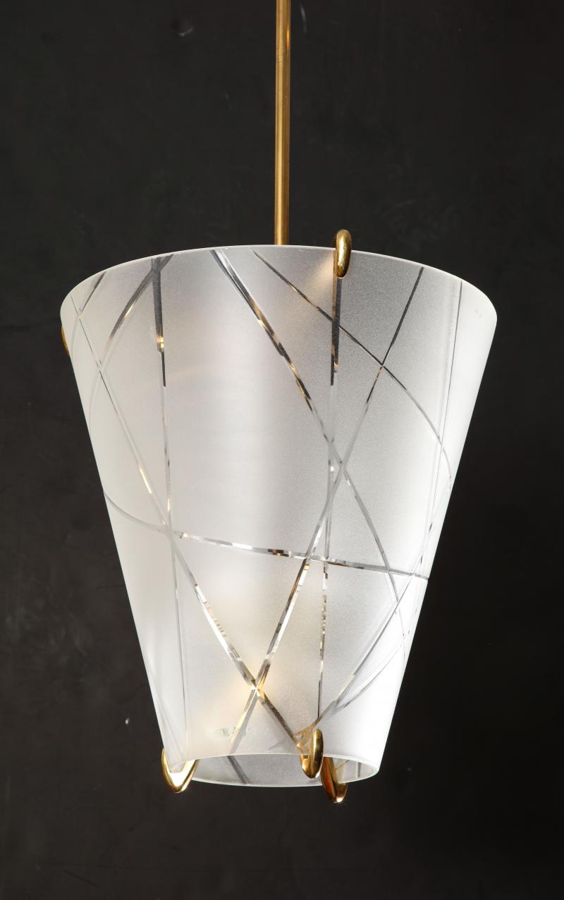 Fontana Arte Lantern. Single glass shade frosted and etched in an atomic pattern. Excellent and all original Brass Structure.